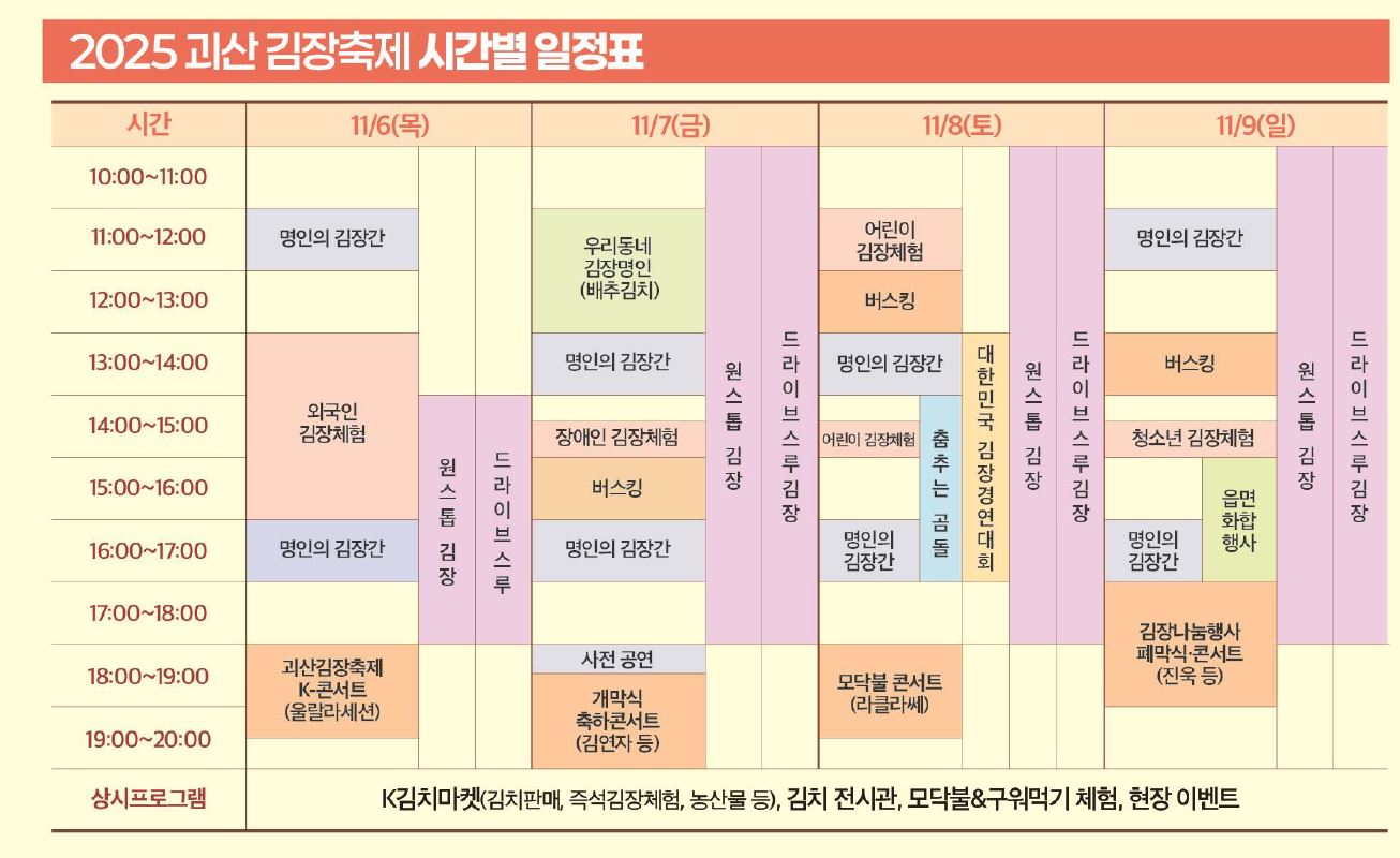 | 기 간 | 2025년 11월 6일(목) ~ 11월 9일(일) / 4일간 - 마을김장체험: 2024년 11월 1일 ~ 11월 30일 (30일간) - 개막식: 11월 7일(금) 18:30 / 괴산유기농엑스포광장 특설무대 (개막 세리머니, 축하 콘서트 – 김연자, 손빈아, 박민수 / 불꽃놀이) |